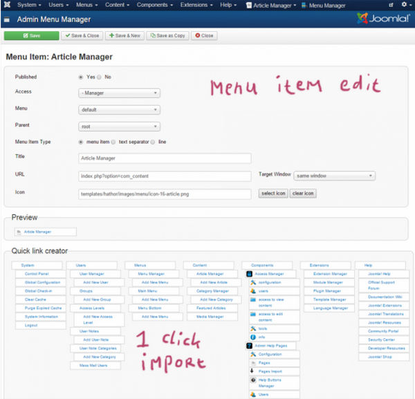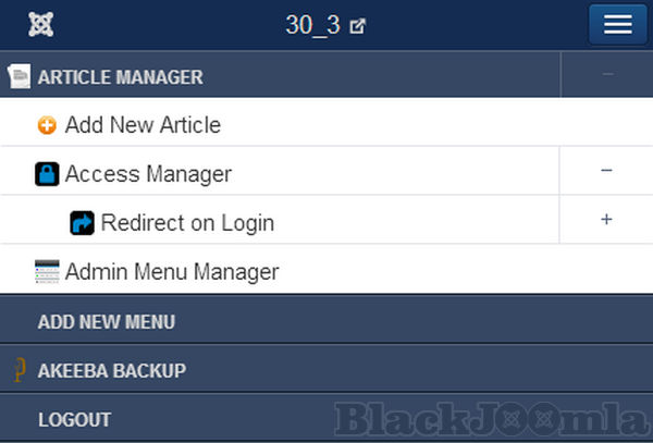 Custom administrator menu at the Joomla backend.