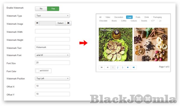 Watermark: Advanced Portfolio Pro enables you to add text/image watermark on all thumbnails/images.You can change width/height of image watermark or font, size, color of text watermark. Watermark position is extremely active because of position and offset settings.
