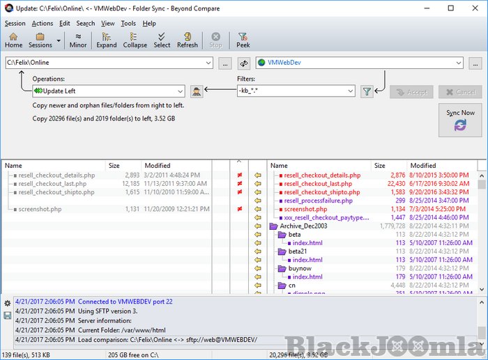 Update your website or make an offset backup; you don't need a separate FTP client. Beyond Compare can connect to FTP, FTP over SSL, and SFTP (SSH) servers and compare, merge, or sync changes with the same commands you're used to. It has saved profiles for quicker access and supports multiple simultaneous connections to speed everything up.