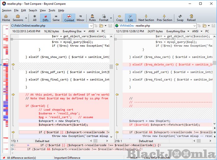 Once you've found specific files you're interested in, Beyond Compare can intelligently pick the best way to compare and display them. Text files can be viewed and edited with syntax highlighting and comparison rules tweaked specifically for documents, source code, and HTML. The text contents of Microsoft Word .doc and Adobe .pdf files can also be compared but not edited. Data files, executables, binary data, and images all have dedicated viewers as well, so you always have a clear view of the changes.