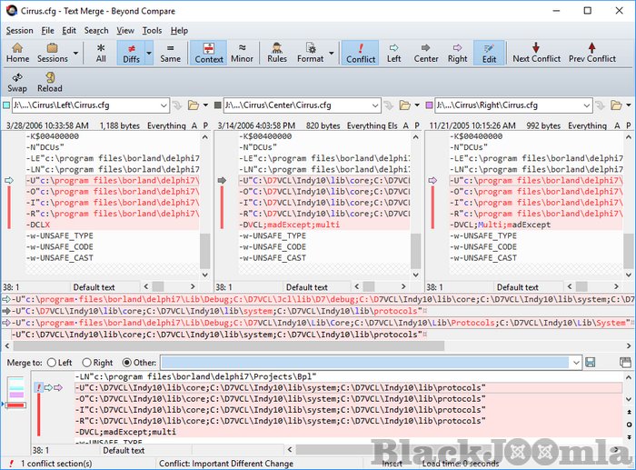 Beyond Compare's merge view allows you to combine changes from two versions of a file or folder into a single output. Its intelligent approach allows you to quickly accept most changes while carefully examining conflicts. Color coding and section highlighting allow you to accept, reject, or combine changes, simply and easily. When merging files you can change any line in the output with the built-in syntax-highlighting editor. By using Beyond Compare's powerful file type support and ability to favor changes from one file, you can trivially accept many changes without even seeing them.