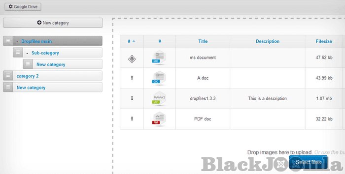 The Google Drive and Dropbox integrations brings a two way synchronization for your files. So you can mange and sync files from Dropfiles or from Google Drive or Dropbox. An import file tool is also available to take back files from other component or server folder.