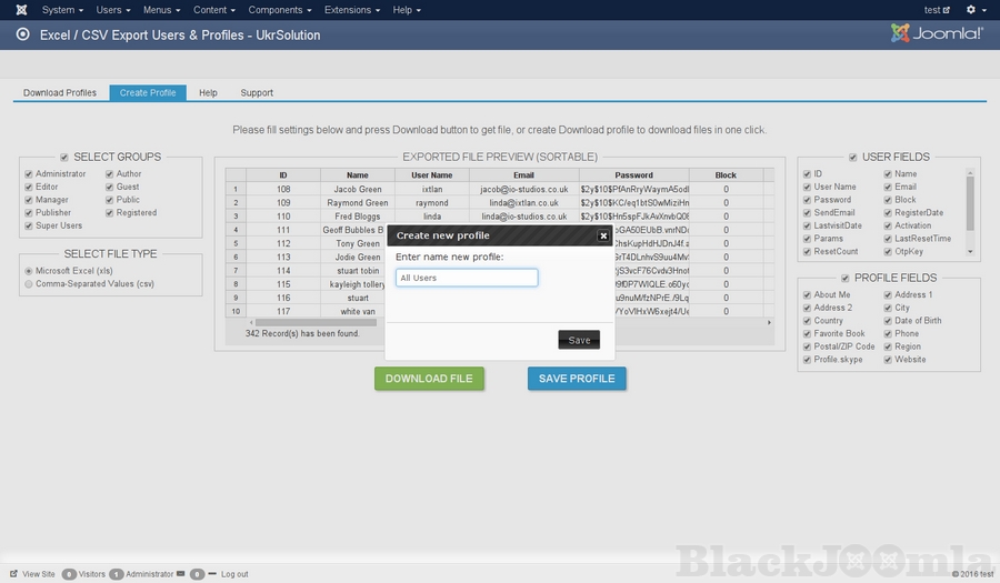- Profile Sharing - For example, you need to allow your manager to download a list of "Students" without allowing him to log on to Joomla Admin Panel. With this tool, you can create a special Profile and then grant access to a particular user and/or group of users. For more details please check the FAQ below.