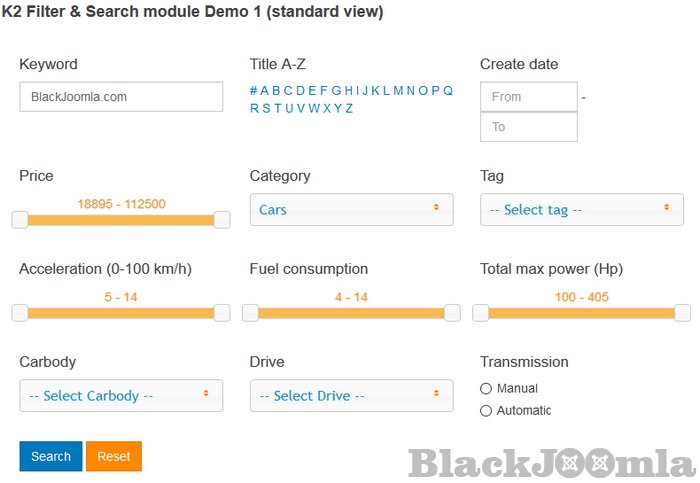 - Display search fields as text field, drop-down select, multi-select, slider, slider with range value select, radio, tag (ability for multiple tags select), category, item title (text and A-Z), item text, item rating, item creation/publish dates;