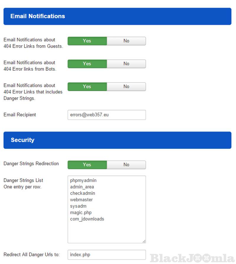 Redirect all URLs that contain a danger string to one specific page, a custom URL or a menu item. You will also be able to manage the list of the danger strings. You can insert more danger strings by adding one entry per row.