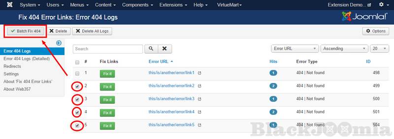 You can choose to automatically redirect all 404 links to one single page, a custom URL or a menu item. This parameter will not override the error URLs that have been already fixed (Redirects).