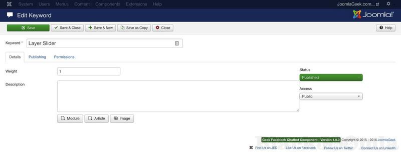 Geek Facebook Chatbot is a Joomla component that dipped its foot into the world of artificial intelligence by offering a customer support and online service. The component enables you to handle unlimited number of customer, 24 hours a day, 7 days a week processing data and assisting customers.The component automatically acts on its own by delivering the most relevant answers to the customers. The component is really designed to have conversations with real human being.