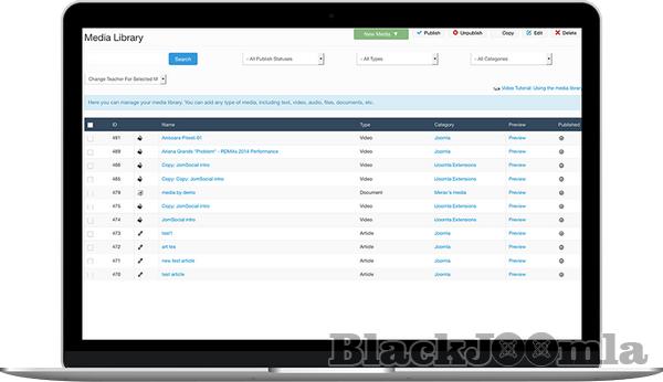 Our Joomla LMS Media Library, allows you to create a comprehensive library of all types of media: video, audio, documents, files and text.