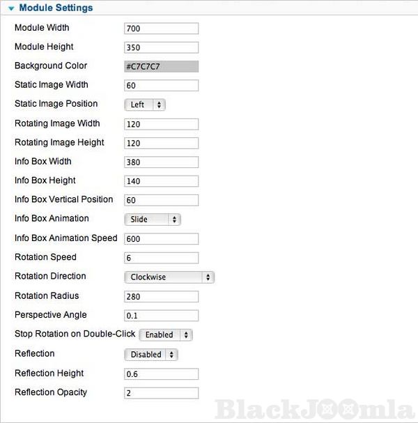 Parameters of this module allow you to set overall width and height and make the module fit into your available space. You can also control rotation radius and perspective angle. You can select vertical position of the info box and select one of three available animation effects for the box. Rotation speed parameter of the icons/images is also customizable. You can enable reflection of the images and control its height and opacity. Fonts of the info box are customizable, so you can easily select font for the headings and font for the info box text. You can also change the font's color and style. In the info box, there's also an image beside text that can be left or right aligned.