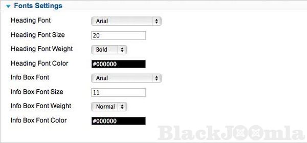 You can select font family (all standard web safe fonts included), font size (in pixels), font weight (normal or bold) and font color for heading and text fonts inside the info box.