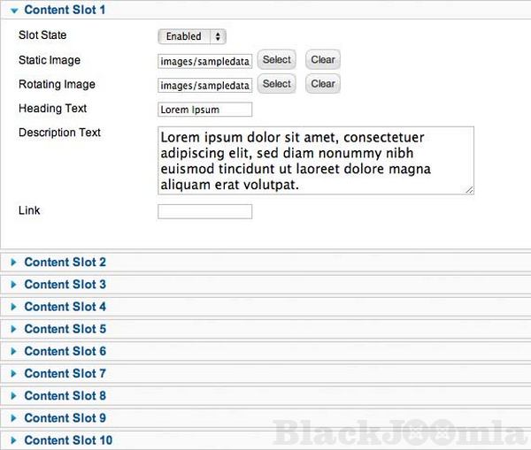 You can enter content for the module into ten available "content slots". Each slot allows you to select rotating and static images. The rotating image is one that rotates, while the static image is the image that appears in the info box. For each slot you can have different heading and text. You can also assign links to the heading of the slots.