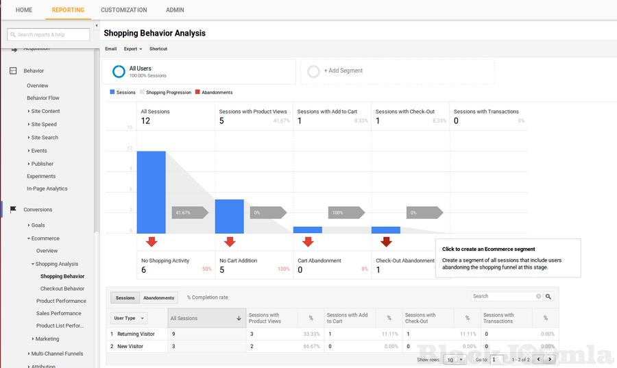 The Shopping Behavior Analysis report lets you see the number of sessions that included each stage of your purchase process, how many sessions continued from one step to the next, and how many abandoned the process at each stage.