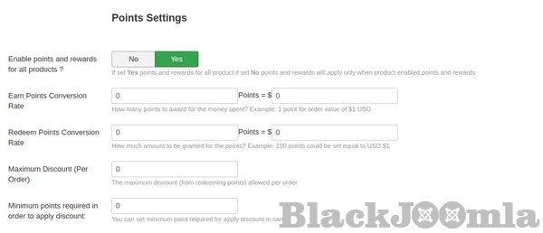 Define points earned for purchases and the value of the points for redeeming. For example if a user buys a specific product you could offer 5 points and set the value as 100 points and the amount that will be reduced for the points earned.