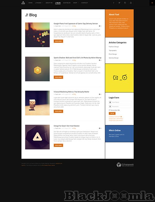 JA Fixel - responsive template for Joomla 2.5 & Joomla 3 version. It supports EasyBlog (Joomla blogging component) and JoomShopping (Shopping cart component). The template also supports RTL language layouts.