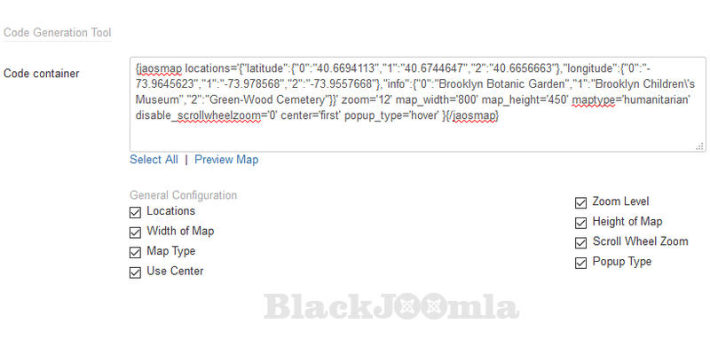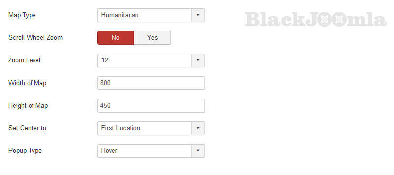 JA Open Street Map plugin main features are built-in as options and parameters in the back-end to help user configure and setup the map easier: map type, popup style, zoom level, map size and more.