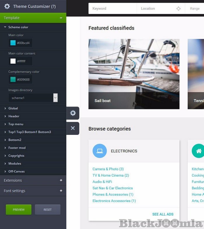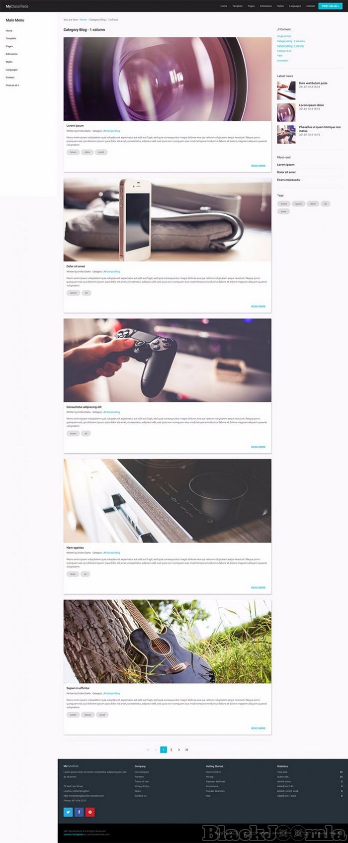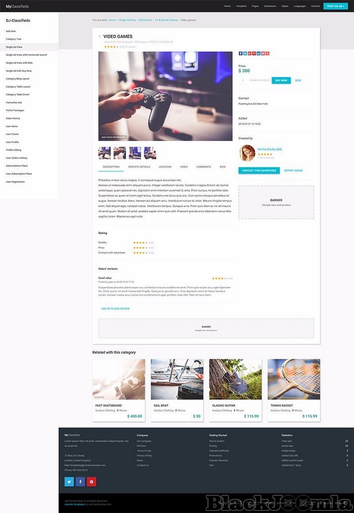 Other extensions used in this Joomla classifieds template easily integrate with DJ-Classifieds so you can create galleries and slides with classified ads as source automatically (DJ-MediaTools) or you can allow visitors to rate and review all ads and advertisers (DJ-Reviews).