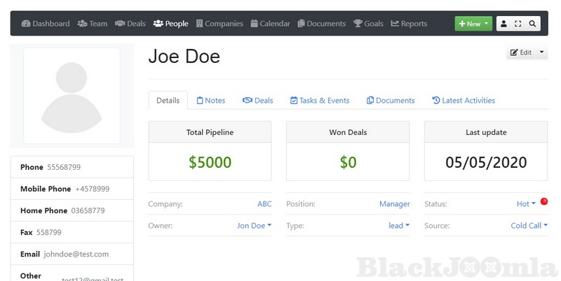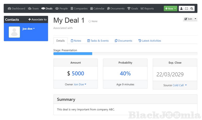 - JoomCRM allows managers to be appointed and oversee a team of other users, these managers have access to all information added by their team.