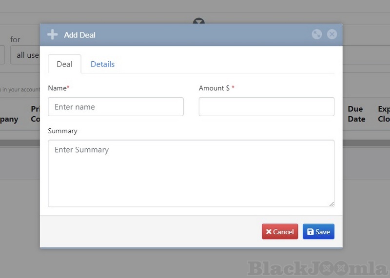 - Ability to add more details to deal like company name, select stage, status , expected close, source, primary contact, probability