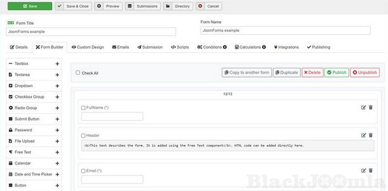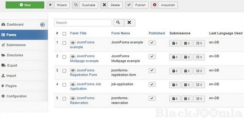 Easy management of forms from backend, you can publish, unpublish, delete, duplicate, run wizard, add form to menu quickly, clear submissions .... and more