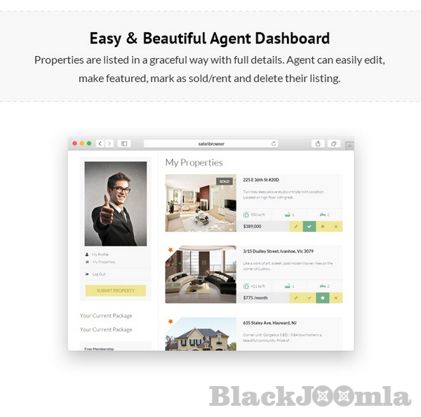 Properties are listed with Description, Featured Image and main information just as in list layout. Agents can quickly make a property Featured or Mark property as Sold/Rent in one click.