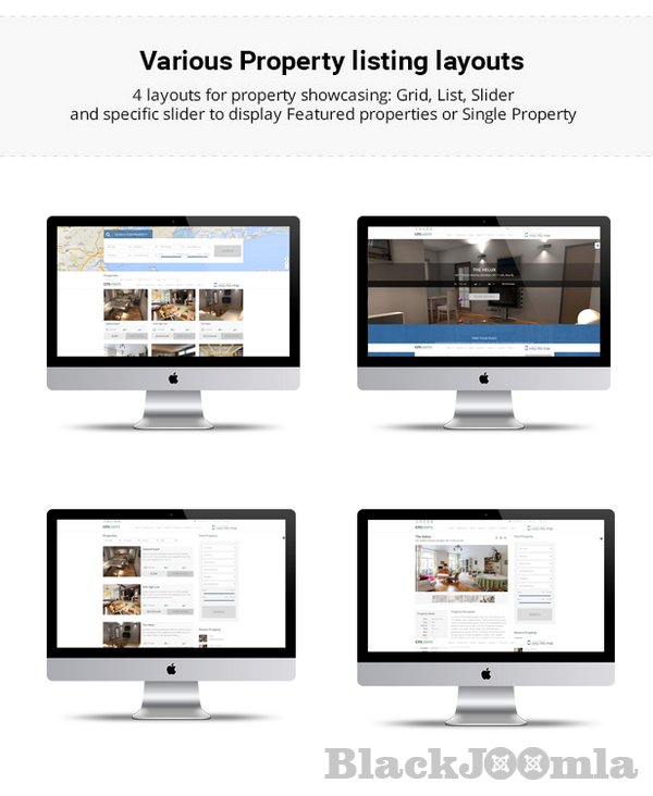 There are 4 layouts for property showcasing: Grid, List, and Slider. Additionally, there is a specific slider to display Featured properties or Single Property.