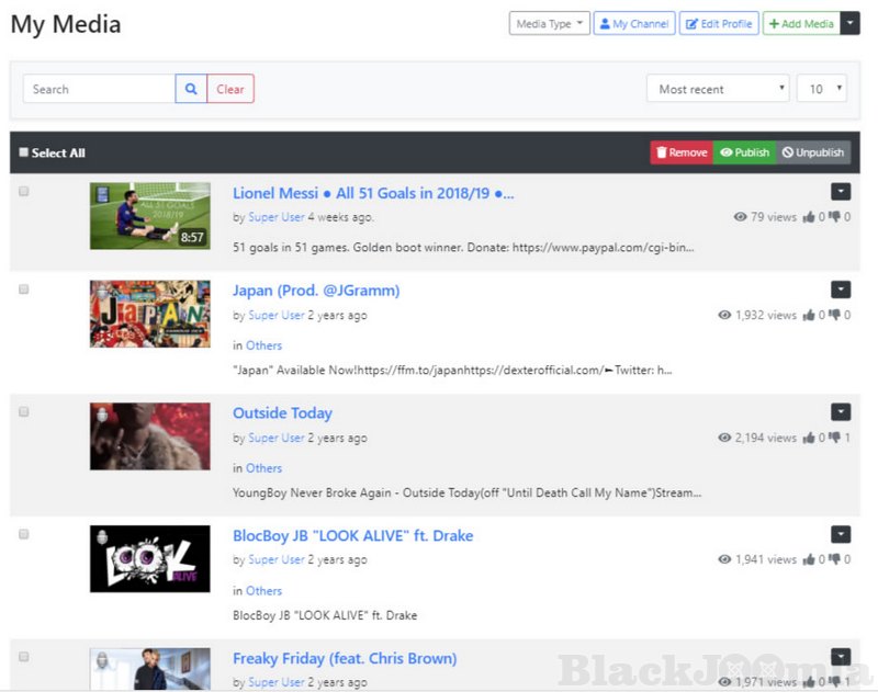 - Media items organization true categories, tags, channels, playlists, albums and groups