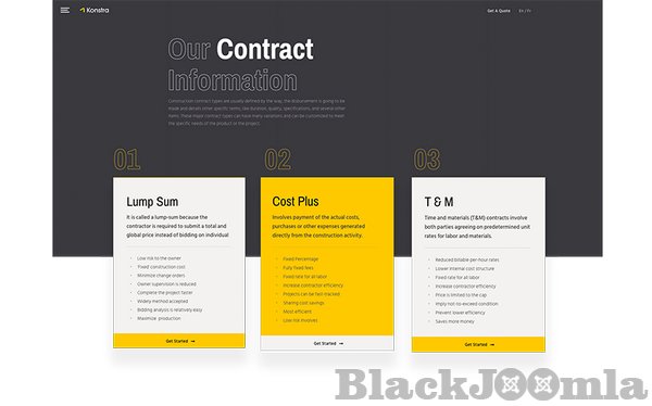 Construction businesses worldwide work with several types of contract mechanisms. Whether your target company supports lump sum, cost plus or T&G method, this Joomla construction template presents them professionally.