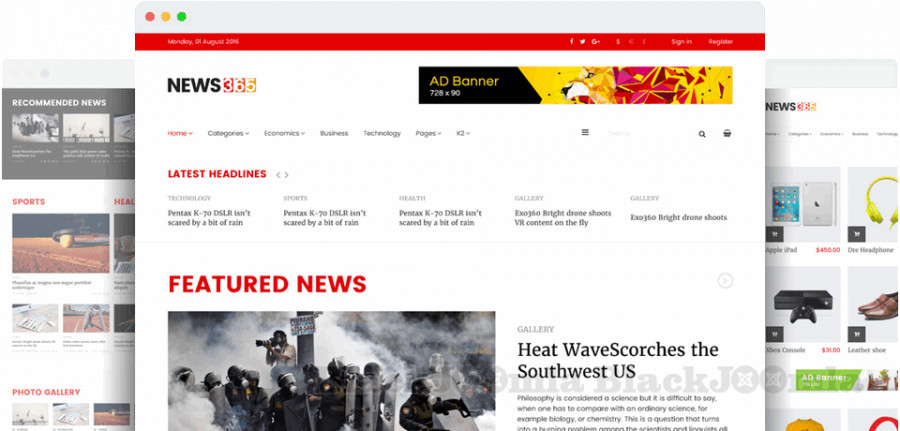 A news and media company earns a major share of its revenue from advertising. News365’s shop section has a mechanism for this, and other pages can utilize Joomla banners in this purpose. The template also offers e-commerce capabilities should you want to sell products/services online.