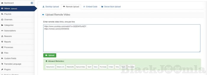 - Remote Upload videos from Direct Video Link, YouTube, Vimeo, Dailymotion, Blip, Metacafe, Extreme, Sproutvideo, Veoh, Vevo, Videofoxnews, Vine, Wat and more...