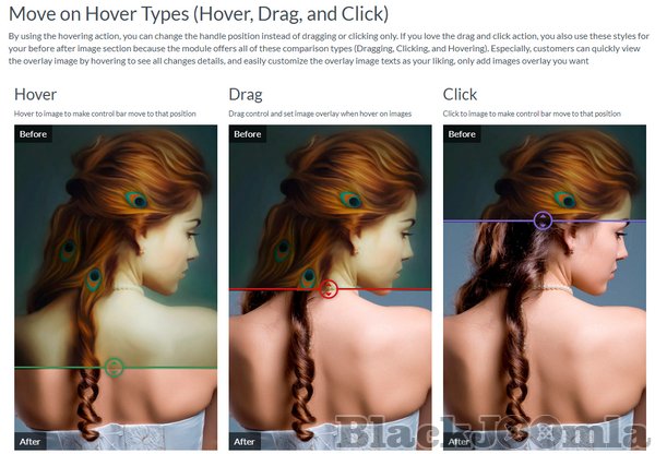 By using the hovering action, you can change the handle position instead of dragging or clicking only. If you love the drag and click action, you also use these styles for the before-after image gallery because the module offers all of these comparison types (Dragging, Clicking, and Hovering).