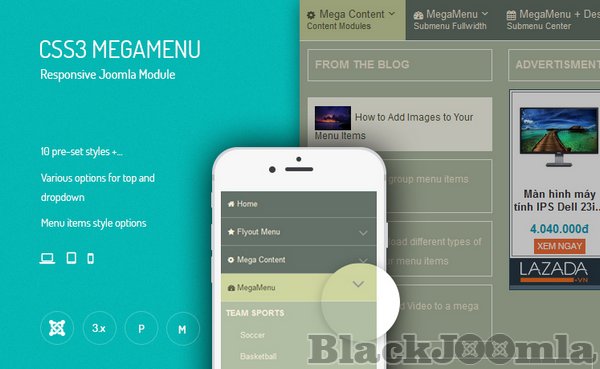 The most outstanding features about this extension are style options and off canvas on the small screen.