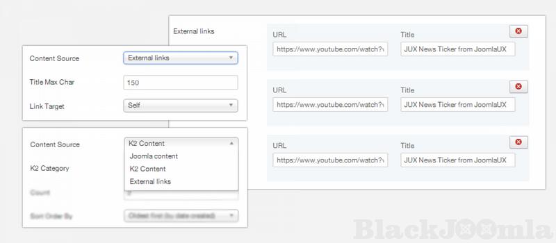 You can choose to retrieve sources from K2 content, Joomla content – the most popular content management system. If you want to use an external link, just insert the link you want and add a title for it.