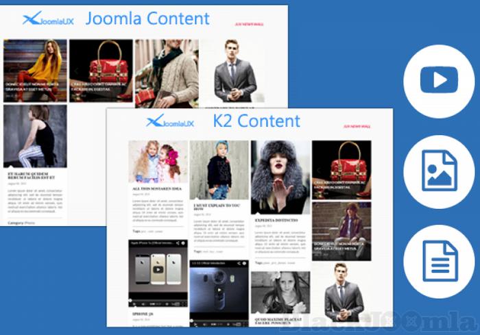A Joomla content contain image, article, and article with image, but with JUX News Wall, you can either use Joomla content or K2 component which could display various types of items like video, article, and image.