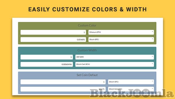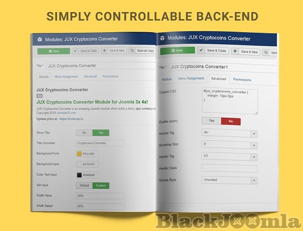 The Joomla Cryptocurrencies module deserves users a simple controllable backend which allows the user to easily set up, change or do some complex customizations as well.