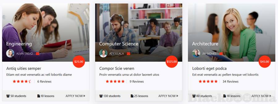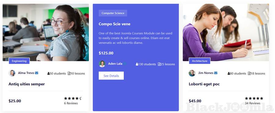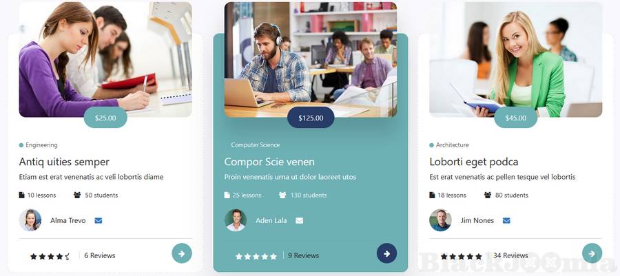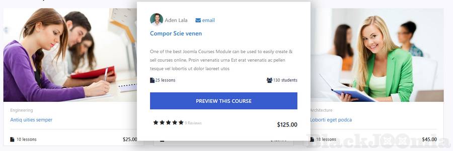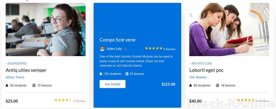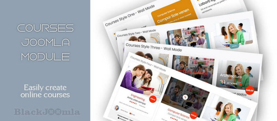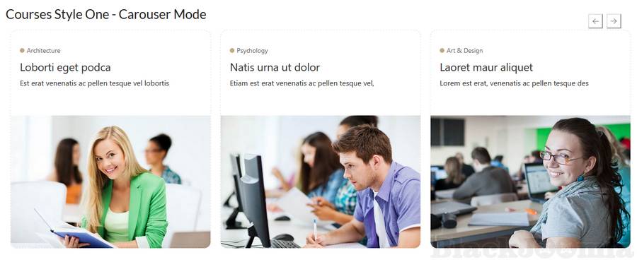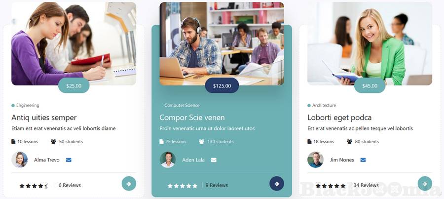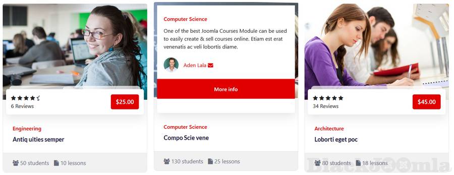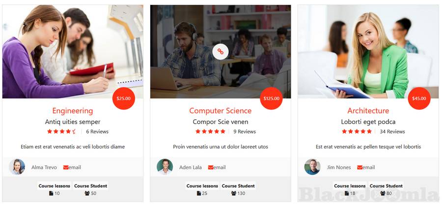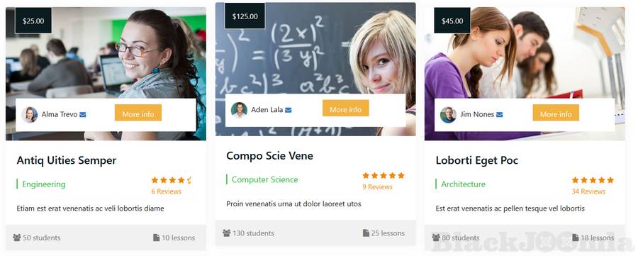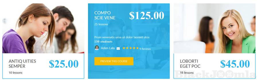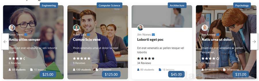 Add courses in carousel or wall mode. For each course is optional to add category, category link, number of lessons, number of students, course picture, course title, course link, course info, price, instructor photo, instructor name and email, rating and reviews number.
