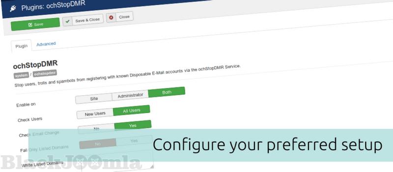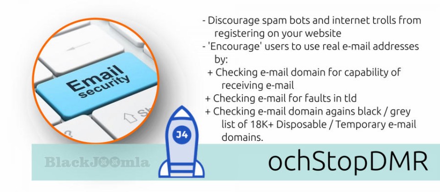 With the ochStopDMR system plugin, you can check every mail domain that a user uses to register on your website or subscribes with on your AcyMailing mailing list. When a user registers or (configurable) when a user changes his user profile, a request is made to an external API that checks the domain part of the E-mail: