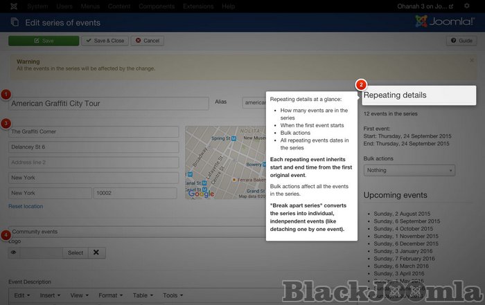 Make your events repeat daily, weekly or monthly. Ohanah summarize repeating rules, so it's easy to know exactly what are you creating. Save time with bulk editing of all the events in the series. -