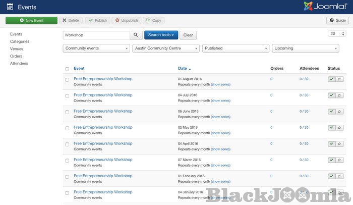 If you use Joomla, look no further. Ohanah ticks all the boxes. You have everything you need, from venue management to registration. Super cool!