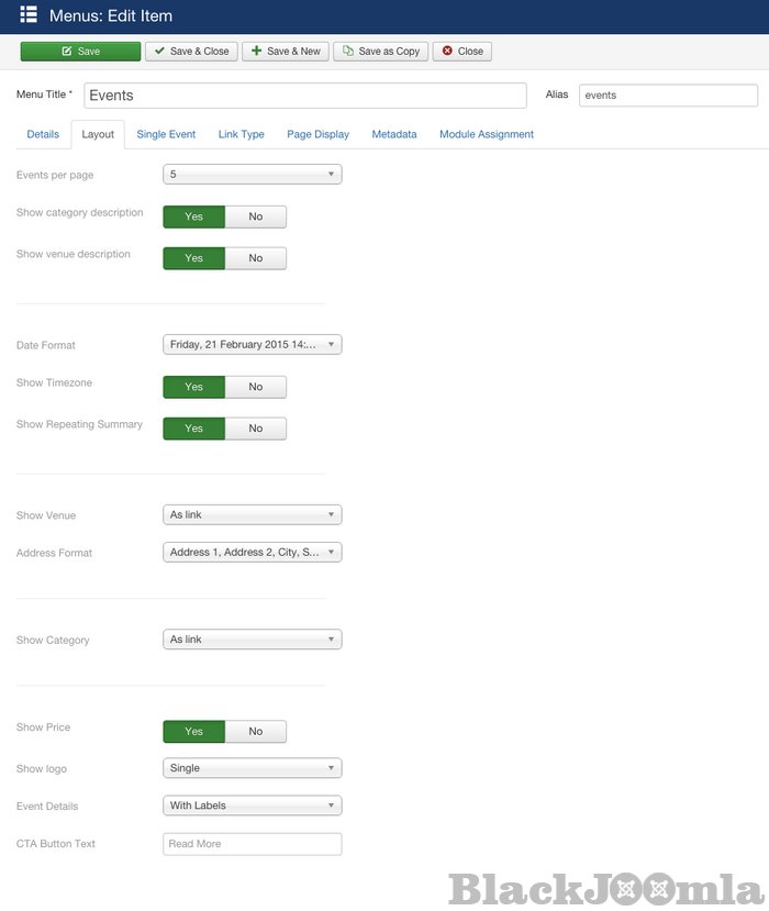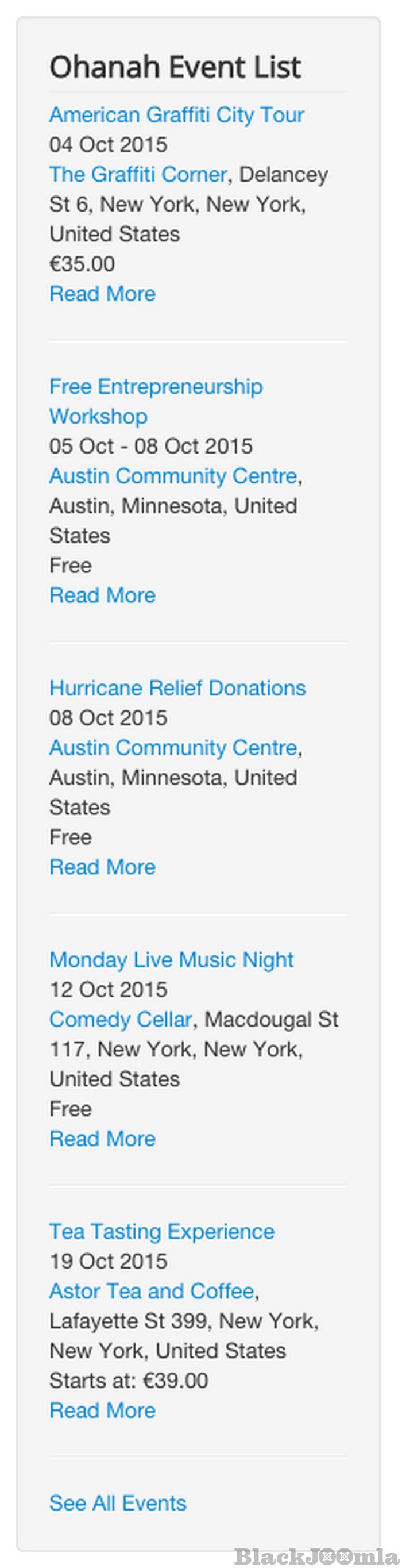 Use Event list to display events in the main area of your site, or display them in a module. Either way you get effortless control over the list with Layout options. -