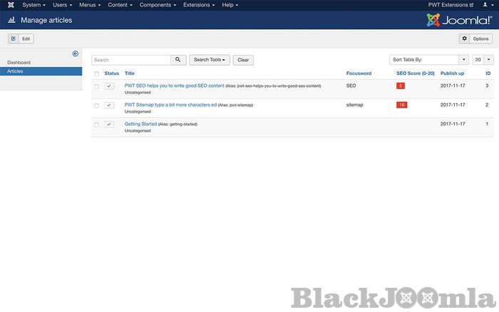 The PWT SEO backend component provides an overview of all articles, custom URLs and Menus with an SEO keyword or key-phrase configured. It will display the keyword and actual score of the content. Easily find pages that can use some SEO love