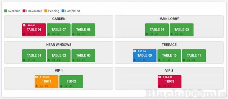 Table management: Tables can be added and assigned to separated areas. Table can have different min and max seats allocation which can be used for online table booking.