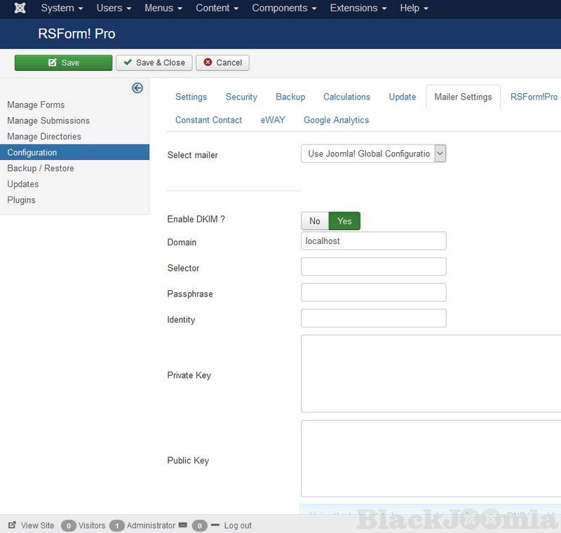 The RSForm!Pro Mailer plugin configuration can be done from Components > RSForm!Pro > Configuration > Mailer Settings tab.