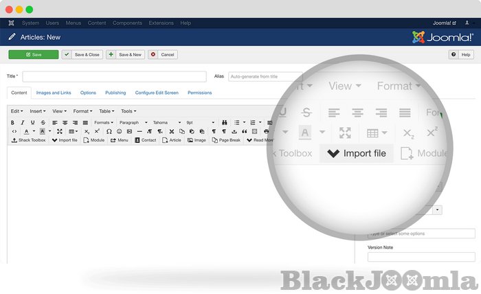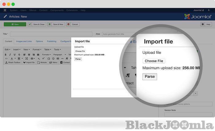 Import spreadsheets into articles or Custom modules by using the "Import file" button through the editor.