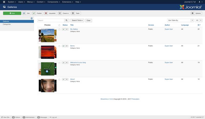 Showtime comes with a full featured administration interface allowing you to manage all your site galleries. You can edit all the galleries you have created (through Custom Fields or Editor) or create new galleries which are not connected with any content in your site. Then just use the Showtime module in order to display your image galleries.