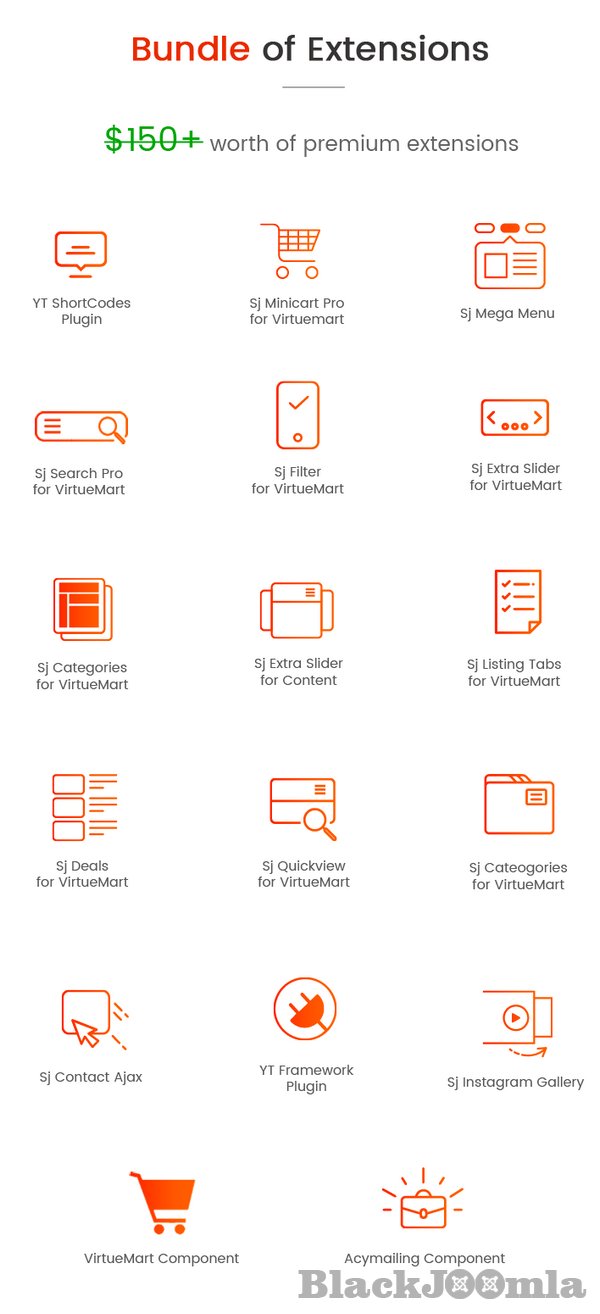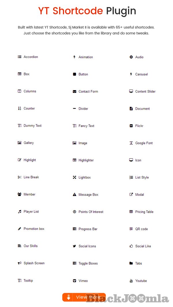 Furthermore, Sj Market II is powered with VirtueMart 3 component along with lots of advanced eCommerce features and functions such as: Mega Menu, Drag & Drop Builder, Ajax Filter for VirtueMart, Mini Cart Pro, Product Quickview, RTL language, 65+ Useful ShortCodes built-in..... You can build an eCommerce website just in few minutes without much coding knowledge.