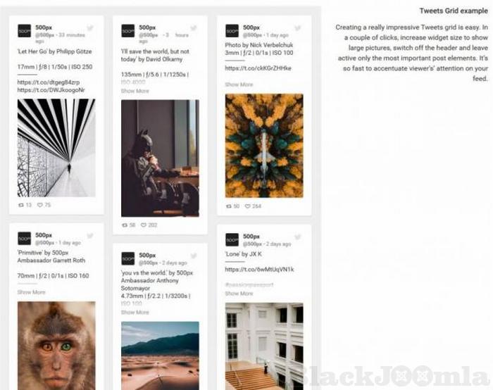 - All photos and videos open in a stylish popup directly on your Joomla website without leaving to Twitter site