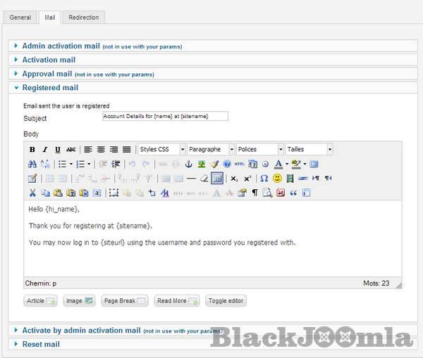 You can easily configure the mail send during registration, the mail can be send in html format.