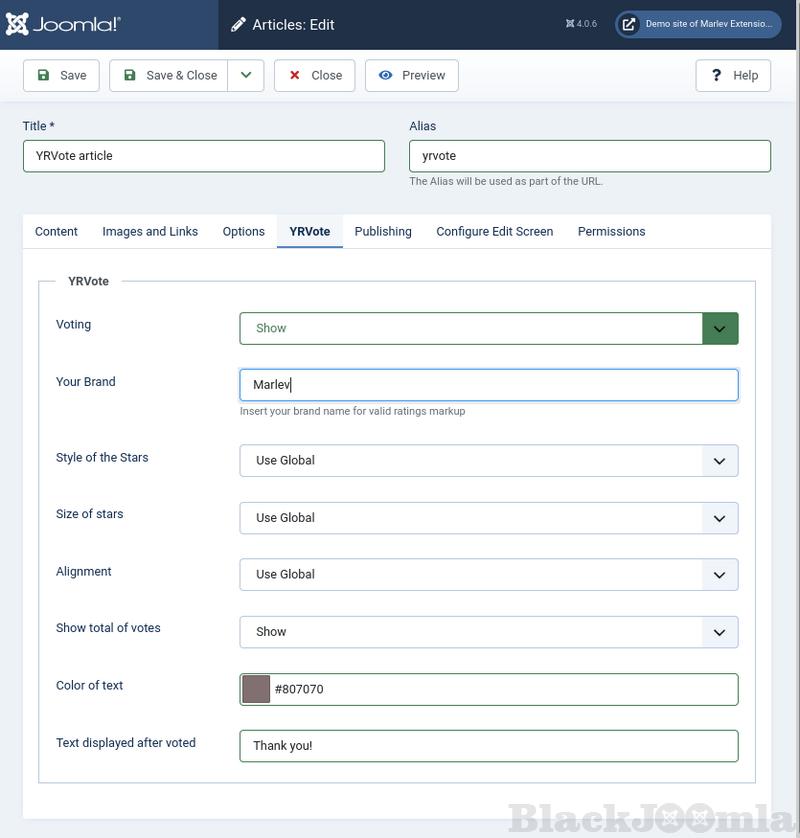 - Instead default Joomla Vote plugin - YRVoe is integrated into the menu options for articles, categories and in the article options.